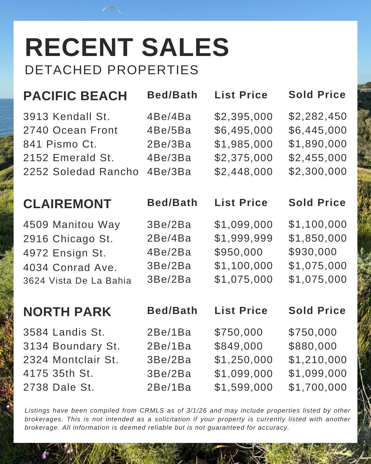 Meanwhile, Clairemont continues to attract strong interest from both move-up buyers and investors. The neighborhood’s central location and traditional homes make it appealing to many different buyers.